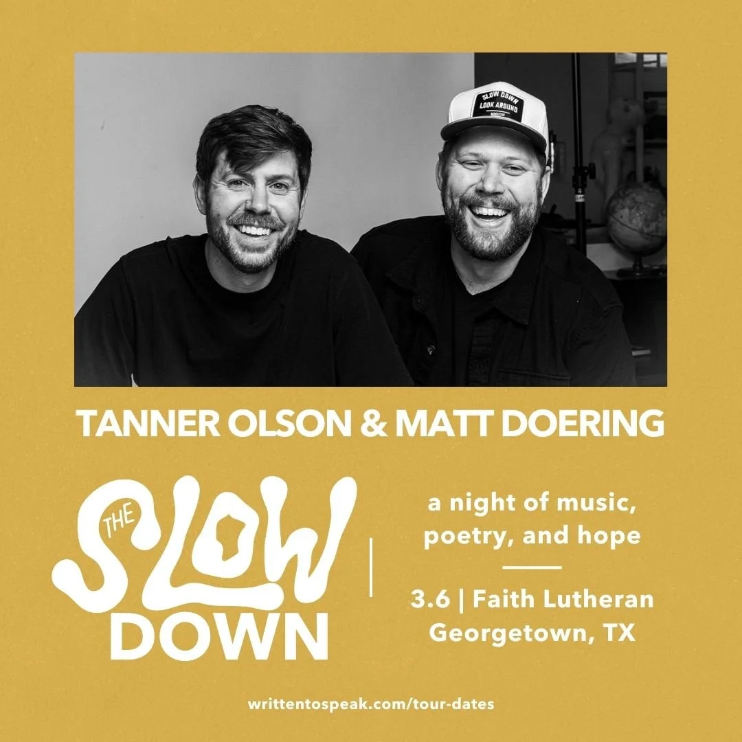 Join us as we slow down for an evening of music, poetry, & hope with our own Matt Doering & author/poet/speaker Tanner Olson. Through original music & poetry, Matt & Tanner invite you to rest in the hope of Jesus.
